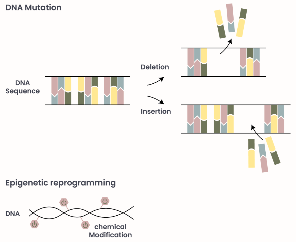 Recipes can get damaged over time as they are used more and more – smudges from fudge can smear words, and pages get torn, lost, or faded. Without clear recipes, chefs can make mistakes, similar to cells. Cancer cells are an extreme case of damaged instructions as they deviate from the highly coordinated series of processes that healthy cells follow. Cancer cell behavior deviation can occur because of DNA mutations, or because of other modifications involving epigenetics (Figure 2)3. A mutation involves DNA addition, removal, or relocation. If we consider our DNA to be instructions, then mutations are content errors resulting in steps being repeated, removed, or modified. Mutations can occur through various mechanisms, including during DNA replication or repair of DNA damage. DNA can be damaged by UV or toxins, such as those related to alcohol and tobacco consumption, partially explaining the link between consumption of these substances to cancer.