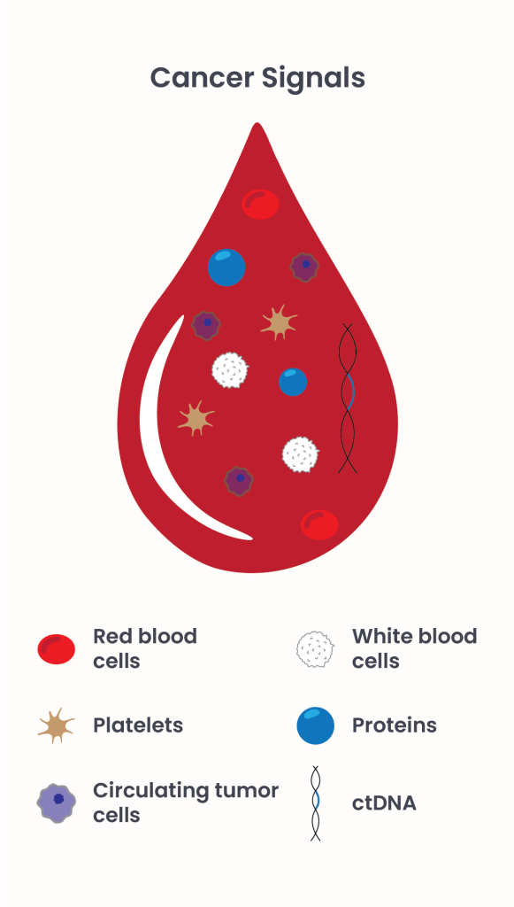 MCED tests offer the advantage of broad detection through a single, minimally invasive blood test. Research over decades has revealed that cancers shed DNA, called circulating tumor DNA (ctDNA), and proteins, into the bloodstream (Figure 1). Proteins and ctDNA originating from cancers are called ‘cancer signals’. Cancer signals help to distinguish healthy from cancerous cells and identify the presence and potential origin of a tumor before symptoms appear.