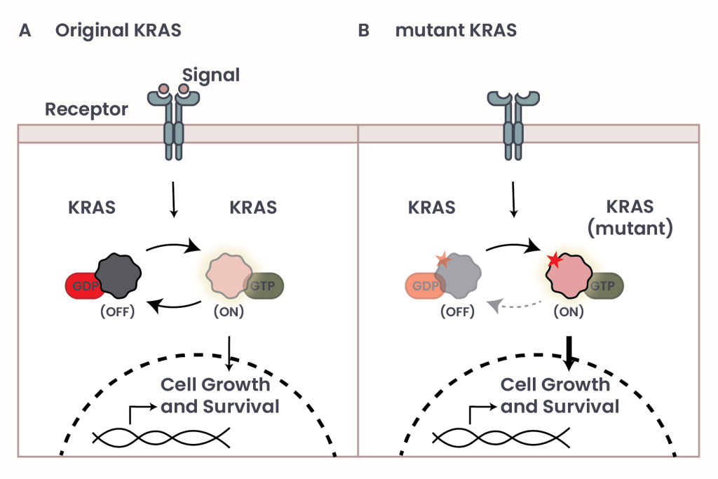 KRAS functions like a molecular switch that turns cell growth on and off. Normally, KRAS is “off” until the cell receives a signal – like a green light – from outside. When that happens, KRAS turns on by swapping out a small molecule called GDP for another one called GTP. This change activates a chain of messages inside the cell, called “signaling pathway”, telling it to grow and survive. Once the signal stops, KRAS turns off again (Figure 1, panel A).
