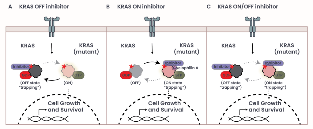 - KRAS ON inhibitors, which bind the active, GTP-bound form of KRAS in conjunction with Cyclophilin A and block messaging, despite being in the ‘on’ state (see Figure 2, panel B).