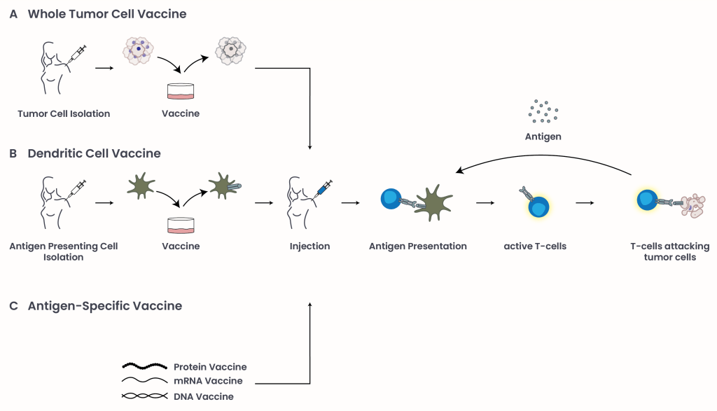 Figure 1: Types of cancer vaccines: Tumor antigens can be presented to the immune system to stimulate an immune response and target cancer cells through three main approaches: (A) whole tumor cell vaccines, which expose the immune system to a broad array of tumor-associated markers; (B) dendritic cell vaccines, which are engineered in the laboratory with TAAs to prime T-cell responses; and (C) antigen-specific vaccines, which deliver personalized tumor antigens using DNA, mRNA, or protein fragments. Dying cancer cells release new antigens, re-stimulating an immune response.