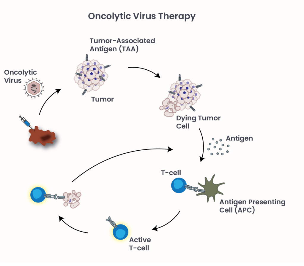 Oncolytic viruses (OVs) represent a novel class of cancer immunotherapy agents, where viruses are modified to infect and destroy cancer cells while sparing healthy ones9. OVs are injected directly into a tumor, where the virus makes more and more copies of itself and causes cancer cells to burst and die. The dying cells release new viruses and other substances, such as tumor antigens, alerting the immune system to the presence of cancer cells and triggering an immune response against cancer cells throughout the body (Figure 2).