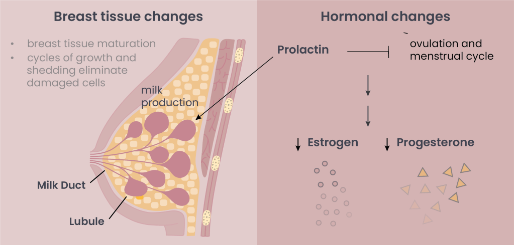 - High levels of prolactin, a hormone that supports lactation, can delay the return of the menstrual cycle, thereby reducing lifetime exposure to hormones like estrogen and progesterone, which can fuel certain types of breast cancers8.