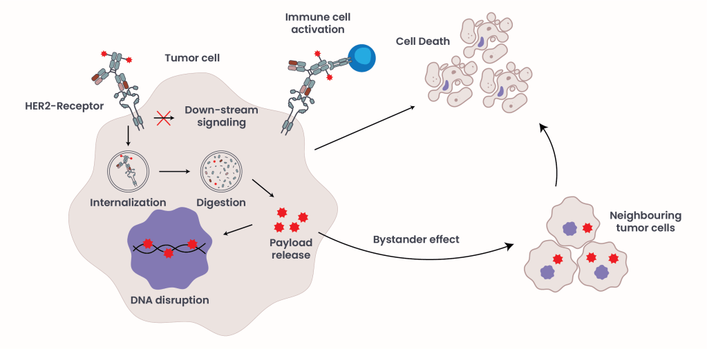 In addition to their direct anti-tumor effects, ADCs of the second generation can also exert an indirect cytotoxic effect known as the bystander effect. After the ADC is internalized and the cytotoxic payload is released within a HER2-positive tumor cell, the payload may diffuse into and eliminate neighboring cancer cells, enhancing overall tumor clearance3, 4. This is particularly beneficial in heterogeneous tumors where not all cells or only a few express HER2 at low levels. In this context, ADCs can bind to HER2-expressing tumor cells and induce direct cell death, while neighboring HER2-negative tumor cells are eliminated through the bystander effect, without requiring HER2 expression.