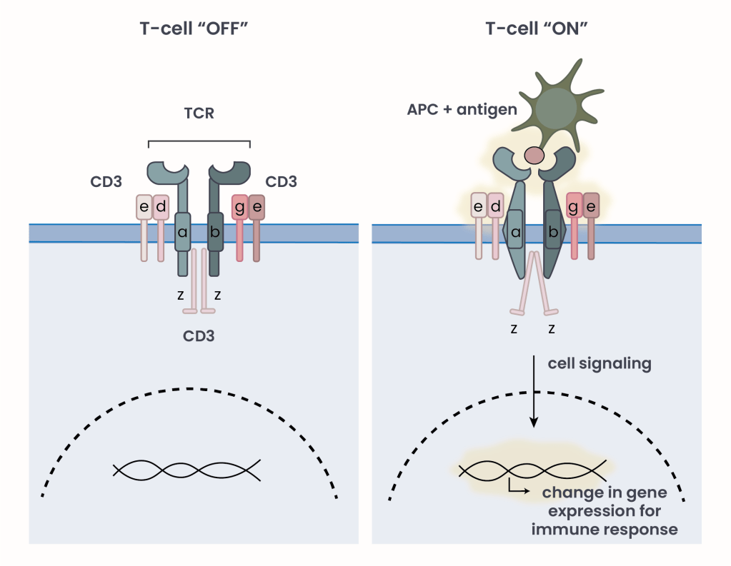 Figure 2. T-cells sense antigens through the T-cell receptor (TCR), and respond through cluster of differentiation 3 (CD3). When an antigen-presenting cell (APC) presents an antigen to a TCR on a T-cell, the T-cell gets turned “on.” The antigen-sensing tip of the TCR protein can vary from cell to cell, allowing for almost all antigens to be sensed. The nearby CD3 proteins then recruit specific proteins, which help to send a message through the cell that reaches the DNA in the nucleus. The message leads to changes in gene expression that facilitate both present and future immune responses.