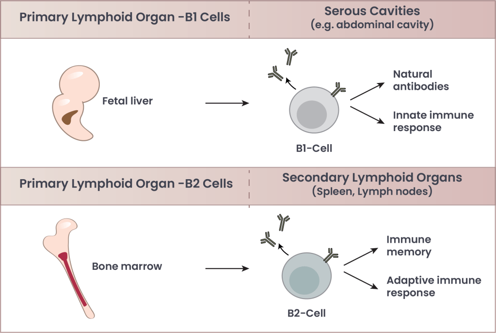 Figure 1. Key differences between B1 and B2 cells. B1 cells and the natural antibodies they produce are determined early in development from lymphoid progenitor cells. Once we are developed, they migrate to cavities throughout our body, prepared to release natural antibodies that participate in the innate immune system, clearing out dead, dying, or unhealthy cells, among other roles. B2 cells are produced in our bone marrow, and then mature fully in the spleen and lymph nodes. They participate in the adaptive immune response by learning from pathogenic threats, and producing increasingly effective antibodies that protect from future encounters with known pathogens.