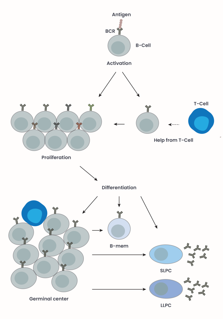 Figure 2. B-cell activation. A BCR encountering an antigen leads to B-cell activation. If the activation signal is weak, T-cells may assist. Activated B-cells multiply while undergoing class switch recombination, becoming mature naive B-cells. These then differentiate further into either germinal centers, B-memory cells (B-mem), or short-lived plasma cells (SLPCs). Germinal centers form with the assistance of T-cells, and can differentiate into B-mem, SLPCs, and long-lived plasma cells (LLPCs). B-mem cells persist long-term to store immune memory, SLPCs are short lived and produce antibodies early during immune responses, and LLPCs persist long term and continue to produce antibodies that constantly surveil the body for target antigens. Picture adapted from Cyster and Allen, 20195.
