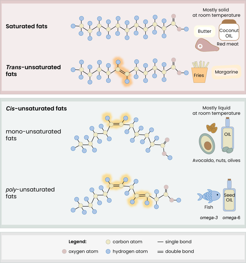 Finally, the good ones: unsaturated fats. As with all “good” things in life, they are only good in moderation. They come mainly from vegetables, seeds, nuts and fish. Differently from saturated, their oils are generally liquid at room temperature. To understand how the physical status changes in these different types of fats and their implication to our health, we need to take a step back into a quick biochemistry class. Hold tight!