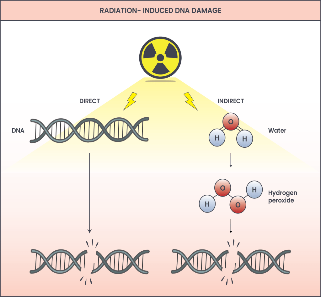 Figure 2. How radiation causes DNA damage. Radiation directly breaks DNA by adding high amounts of energy, and breaking bonds between atoms. Double-stranded DNA breaks are depicted here, however radiation causes many types of damage, including single-stranded DNA breaks and others. Indirect damage to DNA is caused by toxic chemicals produced when radiation strikes water inside of cells, generating reactive oxygen species (ROS). Hydrogen peroxide is depicted here, but others are also made. ROS can cause multiple types of DNA damage.