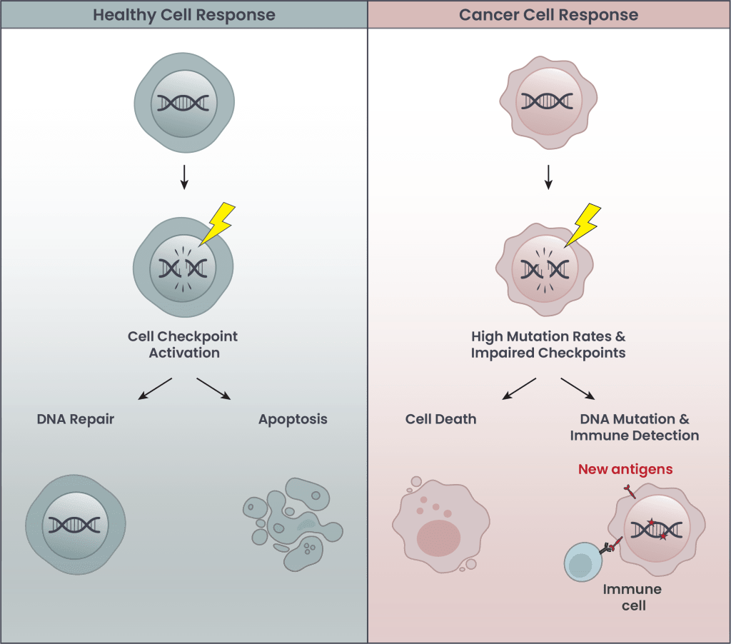 Figure 3. Responses of healthy and cancer cells to radiation. In this figure, radiation is depicted as creating DNA double-strand breaks, the most severe form of DNA damage, but it can also cause other types of DNA damage. (Left) Healthy cells with intact checkpoints respond to DNA damage by slowing growth to allow for DNA repair, or entering programmed cell death called apoptosis if damage is too extensive. (Right) Cancer cells with impaired checkpoints often leave DNA damage unrepaired, resulting in mutations that alter proteins, which are more easily detected as antigens by our immune system.