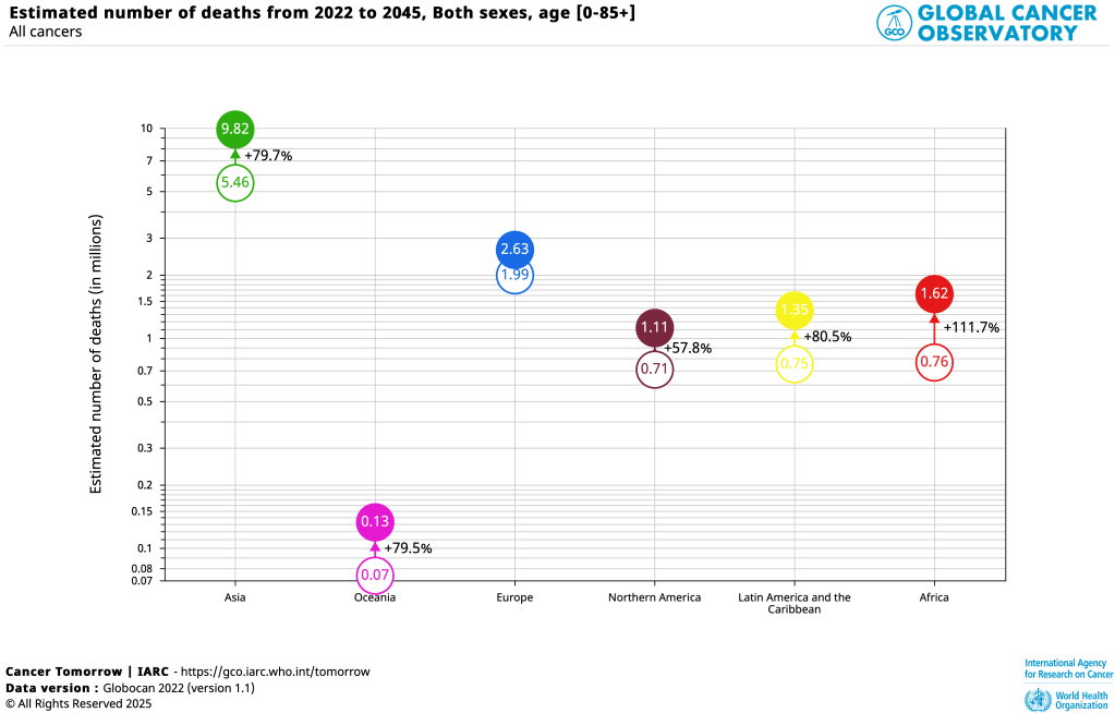 - Cancer-related deaths are projected to increase significantly across all regions by 2045.